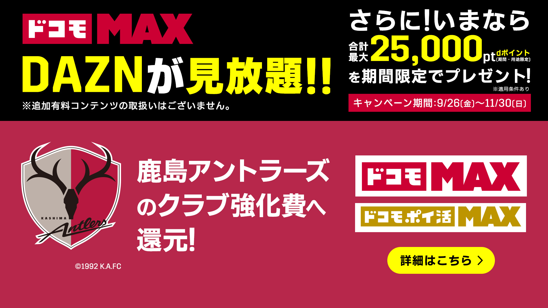 「ドコモ MAX」もしくは「ドコモ ポイ活 MAX」なら、「DAZN」が追加料金なしで見放題に!ご契約いただくとクラブへ応援金が還元されます!