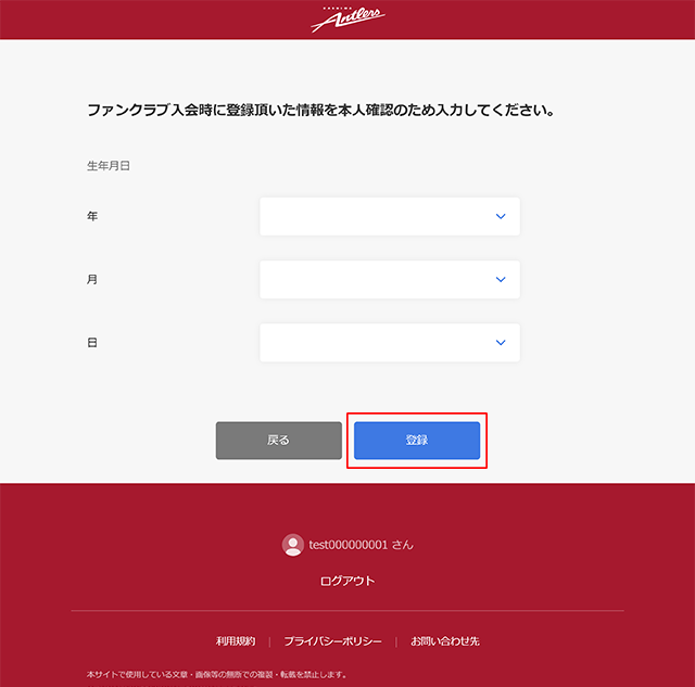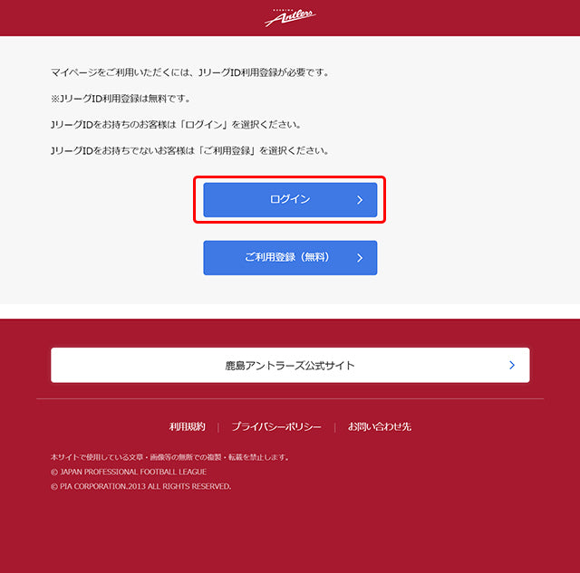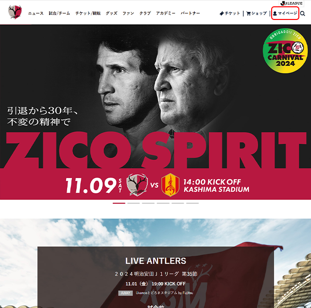 アントラーズ公式サイトから、右上の「マイページ」ボタンをクリック。