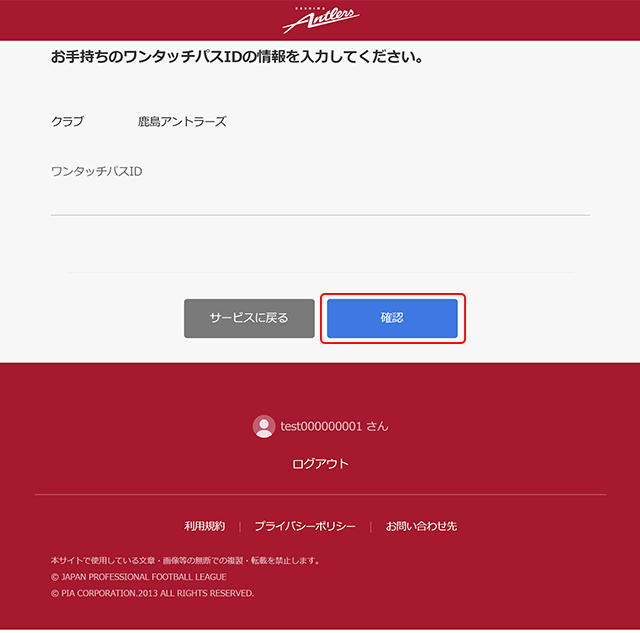 ご自身のファンクラブ会員番号(ワンタッチパスID)を入力し、「確認」をクリック。