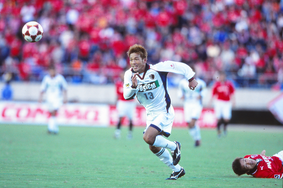 ステージ優勝の行方を左右する、上位対決。代表でともにプレーした宮本恒靖選手とマッチアップ。チーム2点目を決め、2-1での勝利に貢献した。