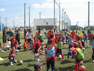 参加した親子32組を2グループに分け、お父さんやお母さんとのスキンシップ等を入れたウオーミングアップを行った後、子どもvs親のドリブルシュート対決や、2vs2の実践形式のトレーニングを行いました。