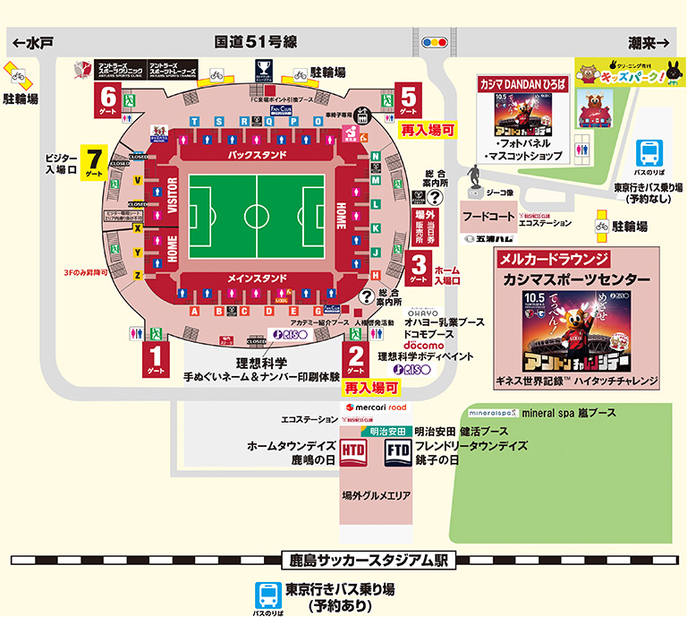 ※試合終了後の5ゲートおよびスタジアム前交差点付近は非常に混雑する見込みです。規制誘導を実施する場合がございますので、係員の誘導に従い、お進みください。また、3ゲート・4ゲート・6ゲートへの分散退場のご協力をお願いいたします。
