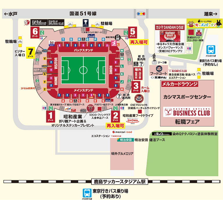 ※試合終了後の5ゲートおよびスタジアム前交差点付近は非常に混雑する見込みです。規制誘導を実施する場合がございますので、係員の誘導に従い、お進みください。また、3ゲート・4ゲート・6ゲートへの分散退場のご協力をお願いいたします。