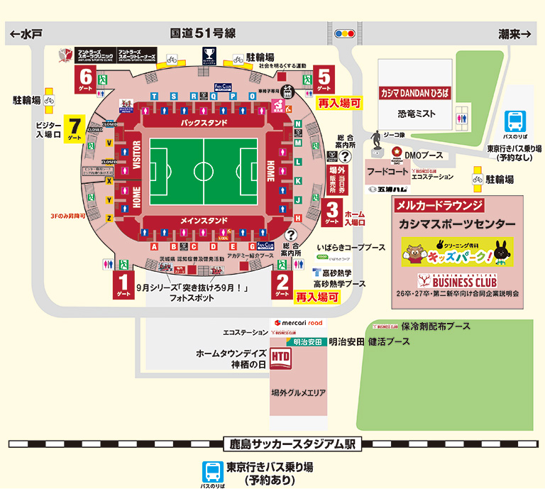 ※試合終了後の5ゲートおよびスタジアム前交差点付近は非常に混雑する見込みです。規制誘導を実施する場合がございますので、係員の誘導に従い、お進みください。また、3ゲート・4ゲート・6ゲートへの分散退場のご協力をお願いいたします。