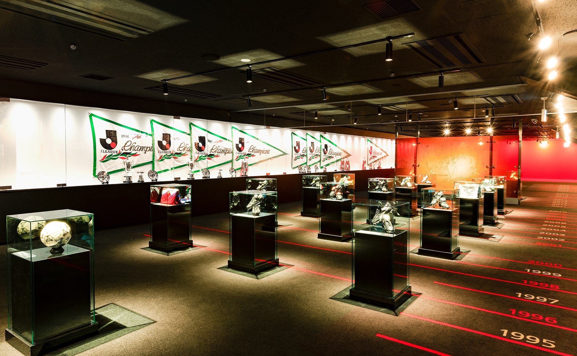 メインスペースでは、アントラーズの栄光の歴史をタイトルフラッグや優勝カップで振り返ることができます。